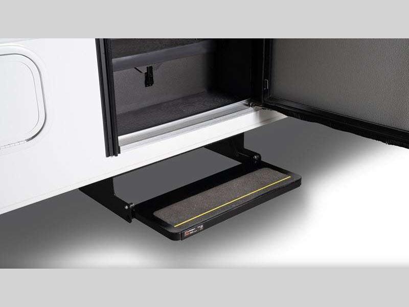 - Electric-powered entrance step with integrated house battery compartment
